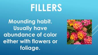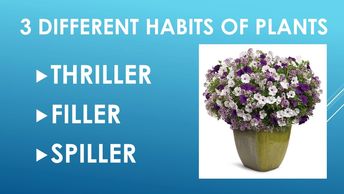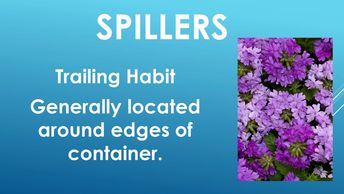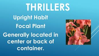 Let's discuss the different plant types that are used to create your planter. They are Thrillers, indicated on slide 2, Fillers indicated on slide 3, and Spillers indicated on slide 4.